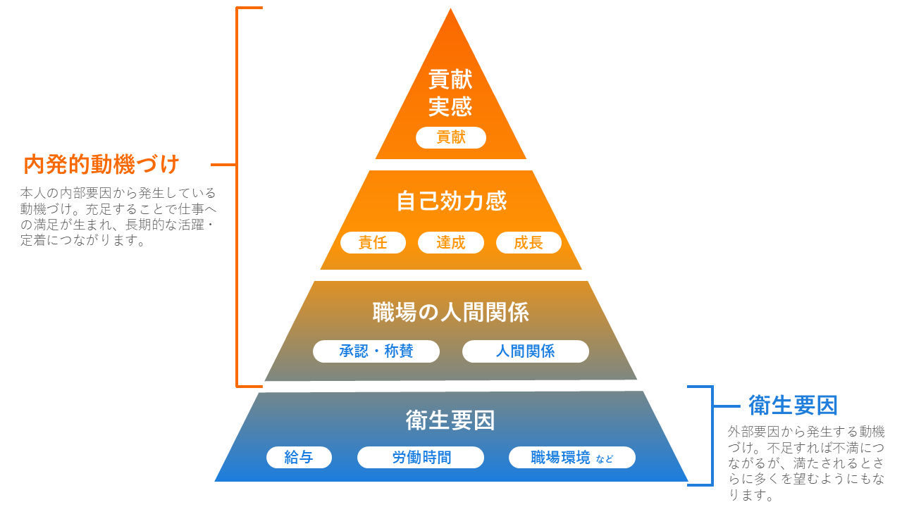 動機づけ要因:「人間関係」「承認・称賛」「達成」「成長」「責任」「貢献」で構成されます。これらは満たされるとやる気を高め、長期的なエンゲージメントにつながります。