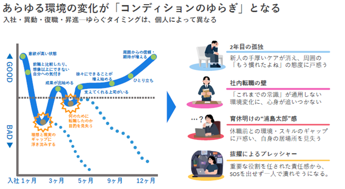 社員のコンディションは、常に一定ではありません。入社、異動、復職、昇進など、人生やキャリアにおけるあらゆる変化は、社員の心に「ゆらぎ」を生じさせます。