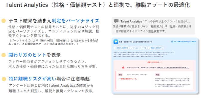 エンが30年以上のノウハウを活かして開発した適性検査『Talent Analytics』の結果と連携することで、コンディション判定や解説、推奨アクションをパーソナライズ。社員一人ひとりの性格・価値観に合った効果的な関わり方を提案し、より精度の高い離職リスク判定を可能にします。すでに実装済の入社1年目の「ファースト」アンケートに加え、既存社員向けの「ネクスト」アンケートでも連携可能となります。