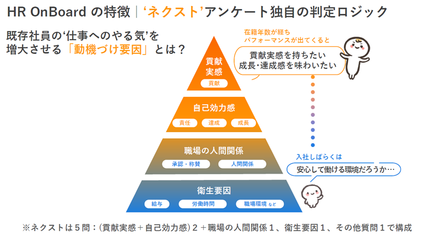 既存社員、特に2年目以降の社員にとって、仕事へのやる気を増大させるのは「貢献実感」「自己効力感」「職場の人間関係」「衛生要因」といった「動機づけ要因」です。ネクストアンケートでは、これらの要素をメインに質問を構成。社員の働く上で大切にしている価値観を3ヶ月に一度確認するなど、モチベーションの維持・向上に繋がる深掘りを行います。